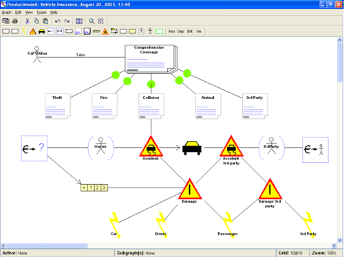 A DSM for specifying insurance products using static declarative models. An insurance expert, non-programmer, draws models to define different insurance products, and then the generators produce the required insurance data and code for a J2EE website.