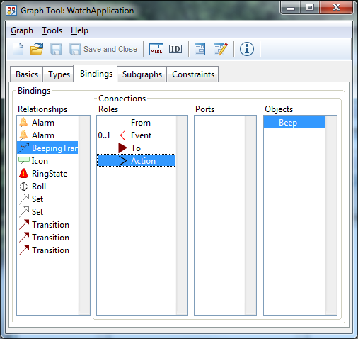 If you've created a symbol for BeepingTransition, you must have successfully created the type, so I guess you've either cleared the name field or then are trying to create a new type with no name. The Digital Watch WatchApplication language specifies the actions that should happen during a Transition by attaching an Action object to the Transition. The various actions can then be connected to that Action object, e.g. an Icon action is connected to the Action with an Icon relationship. If you follow that pattern, life is pretty easy: You can just create a Beep object, Beep relationship and Beep role and a binding for them (with ActionBody role to the Action), then make a _Beep generator that produces the Java code needed to beep, e.g. just Report '_Beep' 'beep();' endreport I wouldn't suggest making BeepingTransition as a subtype, because then if a user draws a Transition (with all its Buttons and Actions attached), and later decides it should beep, he'll have to delete the Transition and draw it again as a BeepingTransition. An alternative might be to add a Boolean 'Beep?' property to Transition. That would allow the user to change later whether to beep or not on that transition. The downside would be an extra dialog whenever a Transition was created, because now there will be properties that could be filled in. You'd also have to work harder to make the code generator and update the framework, because the existing framework only supports Actions attached to Action objects, not directly on the Transition. You'd need to change the _TransitionData generator to add a new bool beep parameter, and update the framework to use it: add the beep bool to AbstractWatchApplication's addTransition(), add the beep bool to the Result class, and change AbstractWatchApplication's handleEvent() to beep as well as perform the Actions: if (result.action != 0) perform(result.action); if (result.beep) beep();