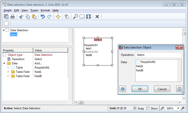 If user chooses just Table we can expect that all its values are selected. Alternatively user can select just fields individually. The actual selection is made with Selection tool allowing the person to use different filters to select, like show all fields, show all tables, navigate into fields by table, etc (see Selection tool and its functionality).