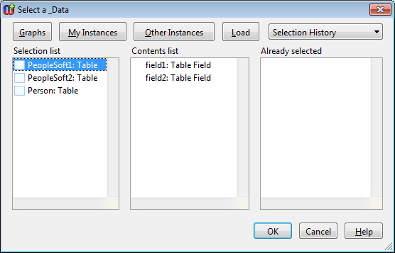 When using Selection tool you may then select first by table and then navigate into its table field to select them (above dialog in my previous answer shows such a case as first among Tables ’PeopleSoft1’ is selected and then you may see two tables of it (field1, field2) and select them (Add from the pop-up menu).