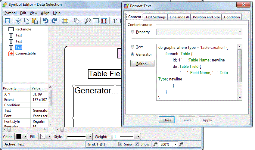 Currently the generator retrieves all tables (and their fields) from the repository and when the number of tables and fields grows showing them all inside a symbol is not likely to scale.
