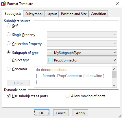 For the second part, you want a symbol for the PropConnector as a dynamic port. The PropConnector already has a blue square symbol for when it is used directly in a graph, but in the Template you can set it to use a library symbol when it is a subsymbol here: Subsymbol | Library symbol named by: Selection | ... | New. Give a name for the new library symbol and a Symbol Editor for it will open. Note that you have to OK the Template dialogs before Windows will allow you to click in the new Symbol Editor.