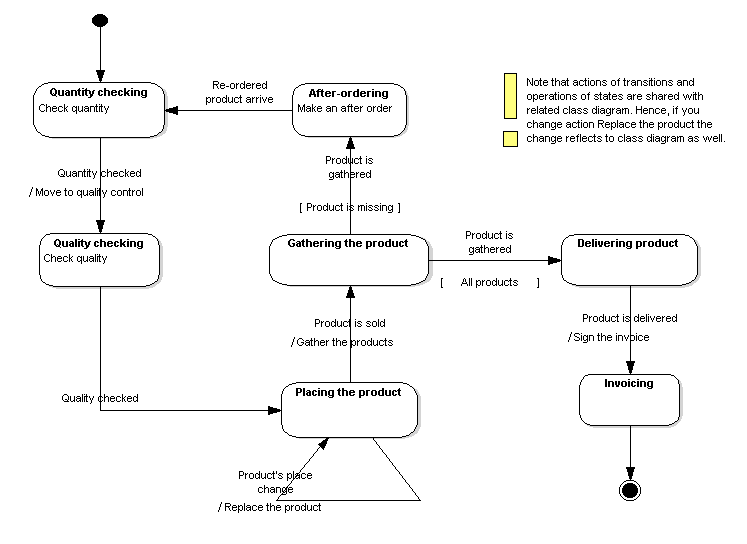 | Note that actions of transitions and operations of states are shared with related class diagram. Hence, if you change action Replace the product the change reflects to class diagram as well. | Note | Note that actions of transitions and operations of states are shared with related class diagram. Hence, if you change action Replace the product the change reflects to class diagram as well. |