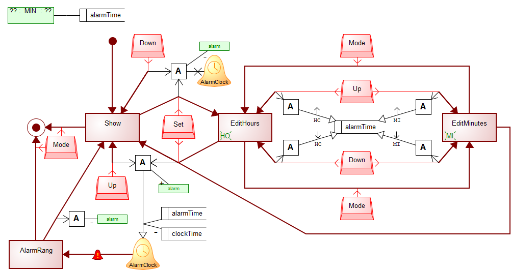 | Documentation | This state is invoked when a system alarm signals that the alarm time has been reached, triggering the RingState transition (red bell symbol). |