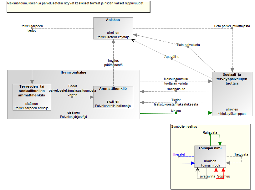 Lähettää tietoa Vastaanottaa tietoa Lähettää tietoa Vastaanottaa tietoa Lähettää tietoa Vastaanottaa tietoa Lähettää tietoa Vastaanottaa tietoa Lähettää tietoa Vastaanottaa tietoa Lähettää tietoa Vastaanottaa tietoa Lähettää rahaa Vastaanottaa rahaa Lähettää tavaraa Vastaanottaa tavaraa Lähettää tietoa Vastaanottaa tietoa Lähettää tietoa Vastaanottaa tietoa Ilmoitus päätöksestä: Tietovirta Tieto palvelusta: Tietovirta Hoitopalaute: Tietovirta Palvelutarpeen tiedot: Tietovirta Maksu: Rahavirta Apuväline: Tavaravirta Maksusitoumus/tuottajan valinta: Tietovirta Tieto palveluntuottajasta: Tietovirta Tiedot laskutuksesta/maksatuksesta: Tietovirta Asiakas: Toimija Ammattihenkilö: Toimija Terveyden- tai sosiaalihuollon ammattihenkilö: Toimija Tiedot palveluseteliä/maksusitoumusta varten: Tietovirta Maksusitoumukseen ja palveluseteliin liittyvät keskeiset toimijat ja niiden väliset riippuvuudet.: Kuvaus Sosiaali- ja terveyspalvelujen tuottaja: Toimija Hyvinvointialue: Toimija