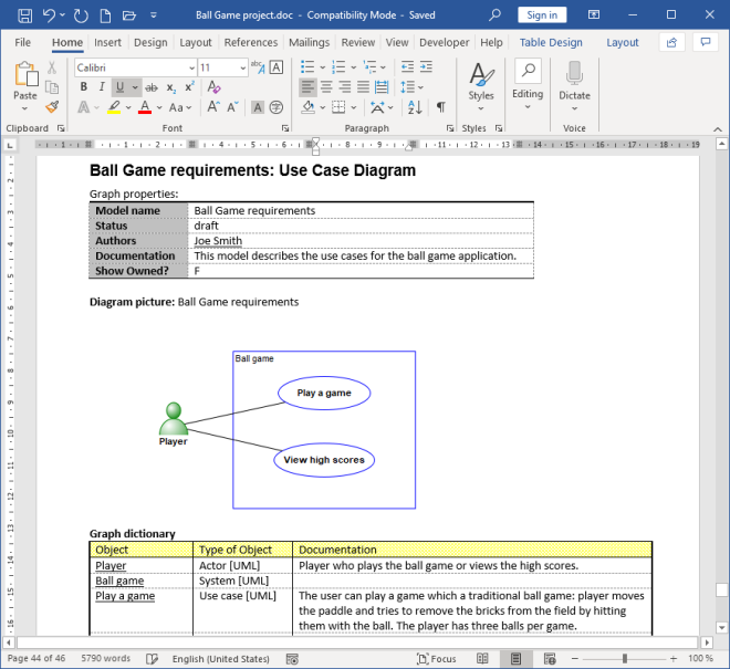 The documentation for each subproject contains a similar set of information, and the documentation for each graph includes the diagram objects, their properties, relationships and links to other graphs. The generated DOC file also includes hyperlinks to refer between design elements.