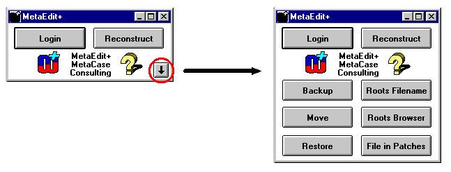 - In the MetaEdit+ Startup Launcher that opens, press the down arrow button at the bottom right, and an extended window appears (Figure 1).