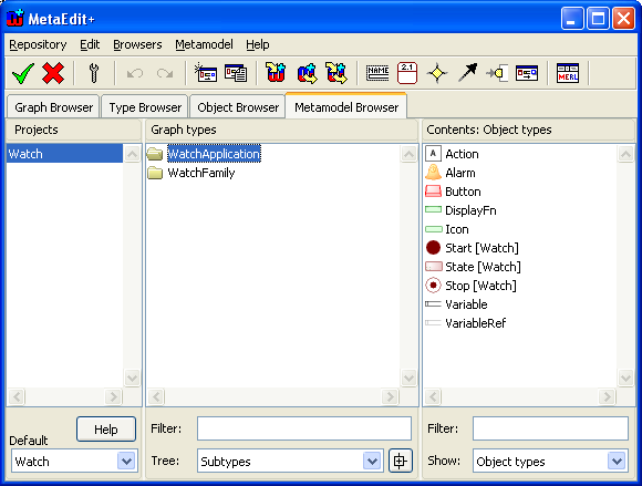 Browser is similar to the other browsers of MetaEdit+. The left-hand list shows