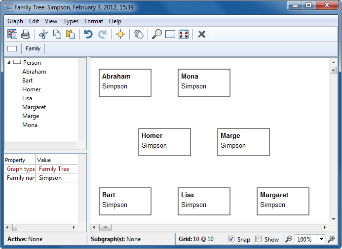 The object is now shown with its properties in the drawing area of the Diagram Editor. Now create a few more objects in the same way. Moving the symbols around and resizing them works the same way as in any drawing tool. To change the property values of a symbol double-click the symbol to bring up the property dialog. When you have drawn a few more objects, your Diagram Editor should look something like this: