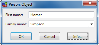 In the Diagram Editor, the second toolbar row contains the object and relationship types of your language. Click the Person button there: the white box at the left end of that toolbar. This starts the creation of a Person object. To place the new Person in our diagram, move the mouse over the drawing area and click the left mouse button. You can now enter the information about the object you are creating in the dialog that opens (as in Figure 4-4). Enter the first name and family name for the Person you are about to create (please note that you can also choose the family name from the list with the mouse) and press OK.