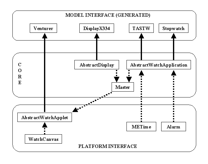 Without any deep theoretical discussion about what is the border between framework and platform, we shall use the following definitions here: The platform is considered to include the hardware, operating system (Windows or Linux), Java programming language with AWT classes and environment to test our generated code (either browser or MIDP emulator). The domain framework consists of any additional components or code that is required to support code generation on top of this platform. The architecture of the watch domain framework – as defined in this way – is shown in Figure 3-5 (solid line arrows indicate instantiation relationships while dotted line arrows indicate inclusion relationships).