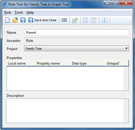 Next we must define the roles we need. Start creating a new Role type: on the Graph Tool’s Types page, move the cursor into the Roles list, press the right mouse button, and select Add New... from the popup menu to open a new Role Tool. The roles for our Family relationship are easy to create, as they do not require any properties or symbols. So, to create a Parent role, just enter ‘Parent’ in the top-most field (Figure 3-17) and press Save.