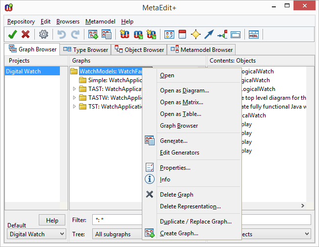 Browser in the MetaEdit+ main launcher. All models related to the watch example