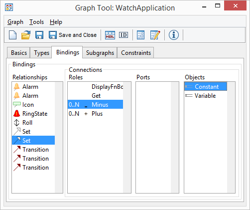 The next thing to do is to integrate this new type into our existing WatchApplication diagram type. Open the Graph Tool from the MetaEdit+ launcher and open the definition of the WatchApplication graph type. Go to the Types page and add ‘Constant’ to the Objects list. Go then to the Bindings tab and add the ‘Constant’ object type for the ‘Get’, ‘Minus’ and ‘Plus’ roles in the bindings of the ‘Alarm’ and ‘Set’ relationships (an example of this kind of binding is shown in Figure 2-13). Now you can create and use Constant objects in your models.