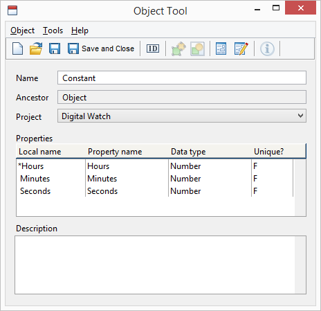 To add a new object type, open Object Tool from the MetaEdit+ launcher and define a new object called ‘Constant’ with properties ‘Hours’, ‘Minutes’ and ‘Seconds’ (make sure to choose number as a data type for each of these properties). With these definitions, the Object Tool should look like in Figure 2-11.