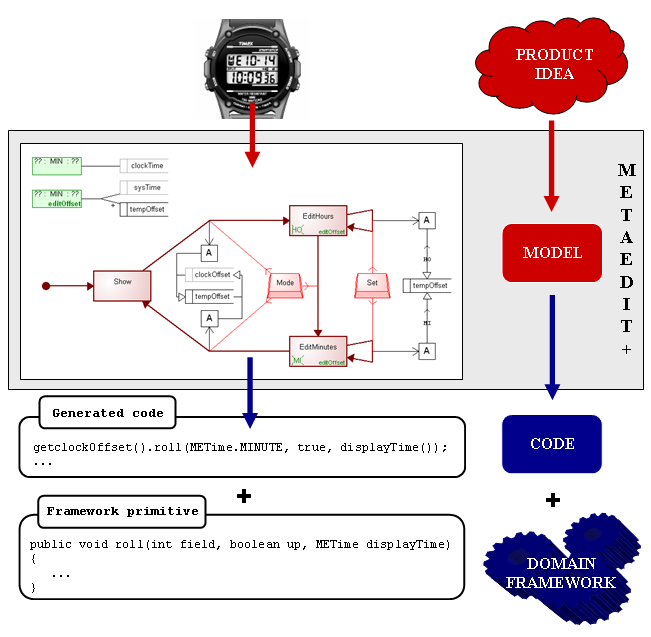 The architecture for a DSM environment like our watch example generally consists of three parts: a modeling language, a code generator and a domain framework. To understand the role of each of these within the architecture, we have to understand how the responsibilities are distributed among them. The basic principle of this distribution is illustrated in Figure 3-1.